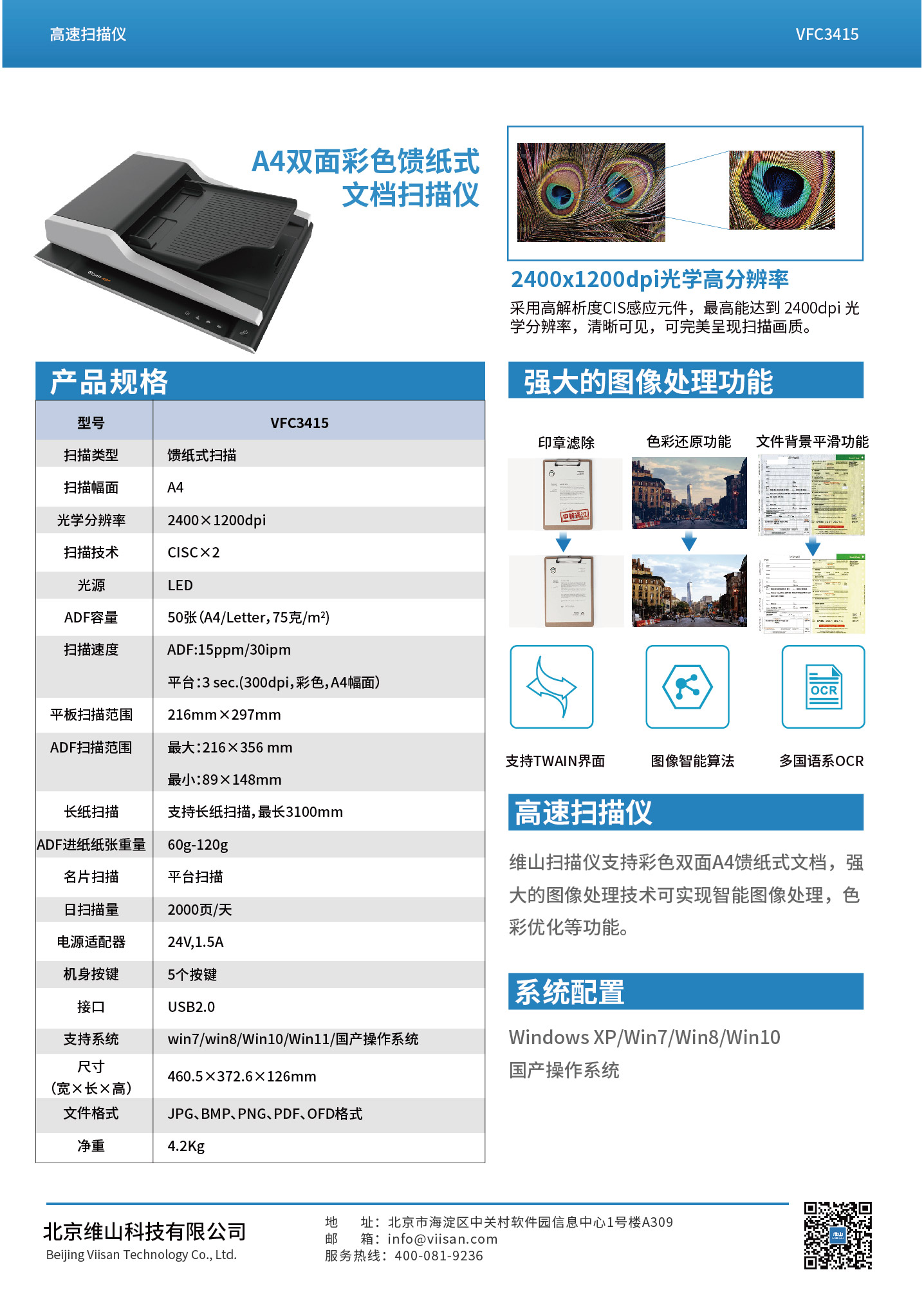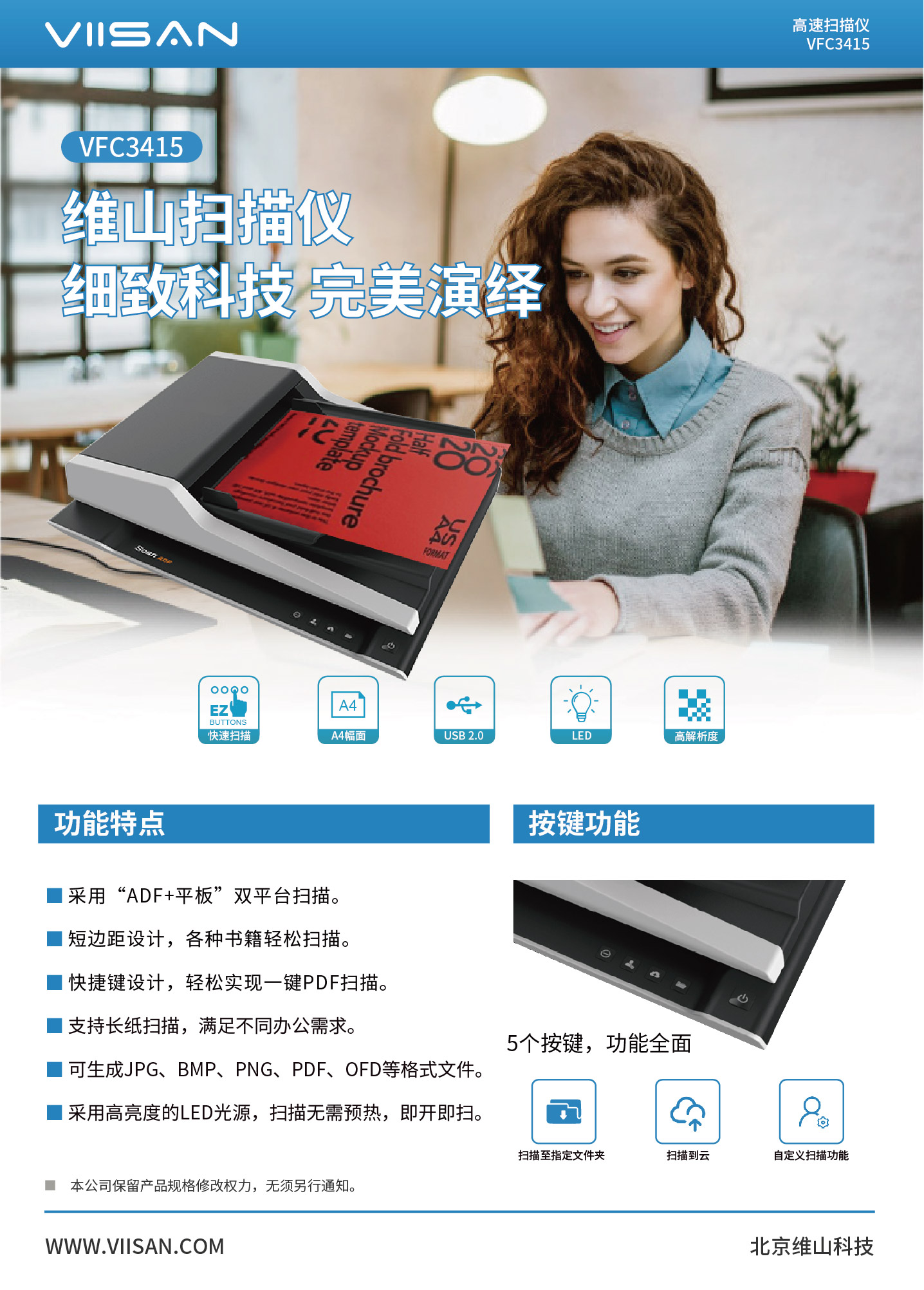 VSC3415扫描仪可扫描文档,相册,书籍,杂志和厚实物品。 它可以快速的帮助您有效地使用四个面板按钮实现文档扫描,电子邮件,打印甚至创建单个或多页PDF。 VSC3415的扫描速度平板最快为3秒(200dpi,A4尺寸)ADF:15ppm/30ipm。 它还提供2400 x 1200 dpi 的最大光学分辨率,扫描更生动逼真的图像的色彩深度处理,并实现更平滑,更细腻的色彩渐变和变化。