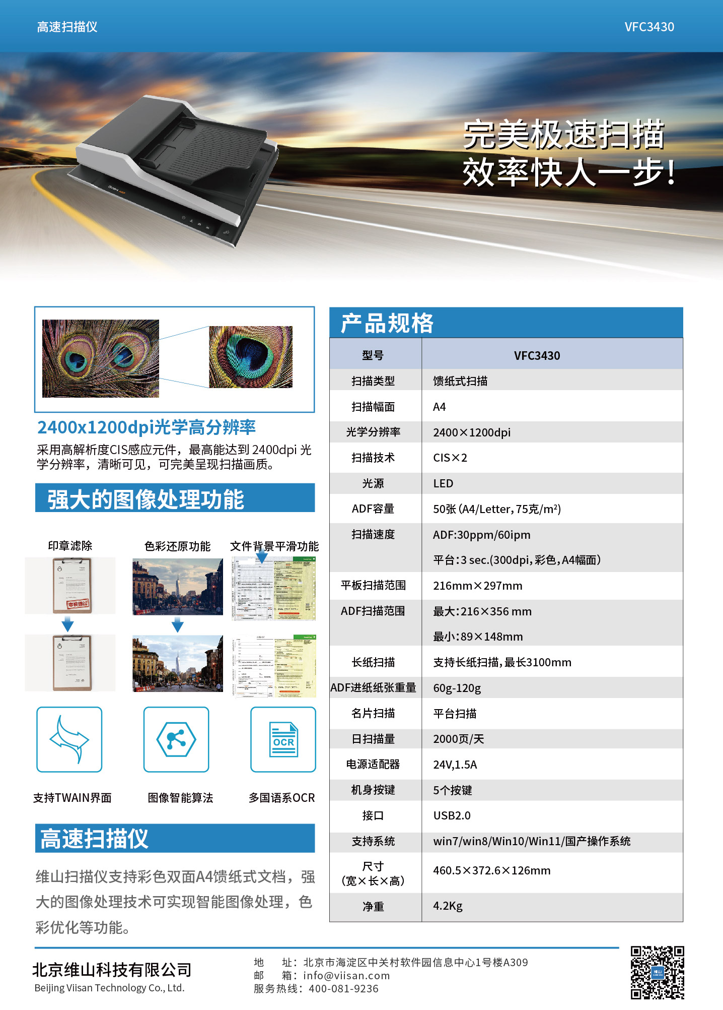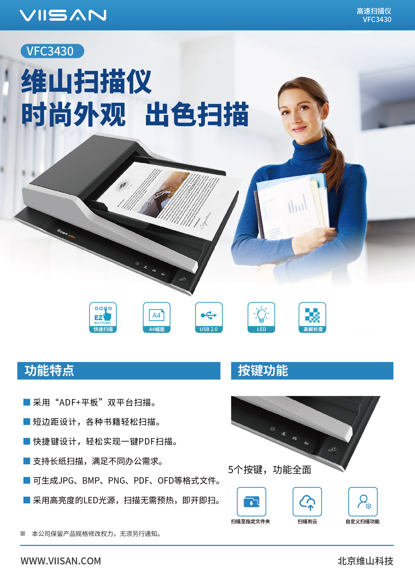 VSC3430扫描仪可扫描文档,相册,书籍,杂志和厚实物品。 它可以快速的帮助您有效地使用四个面板按钮实现文档扫描,电子邮件,打印甚至创建单个或多页PDF。 VSC3415的扫描速度平板最快为3秒(300dpi,A4尺寸)ADF:30ppm/60ipm。 它还提供2400 x 1200 dpi 的最大光学分辨率,扫描更生动逼真的图像的色彩深度处理,并实现更平滑,更细腻的色彩渐变和变化。