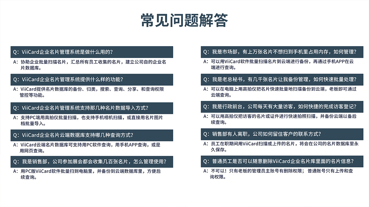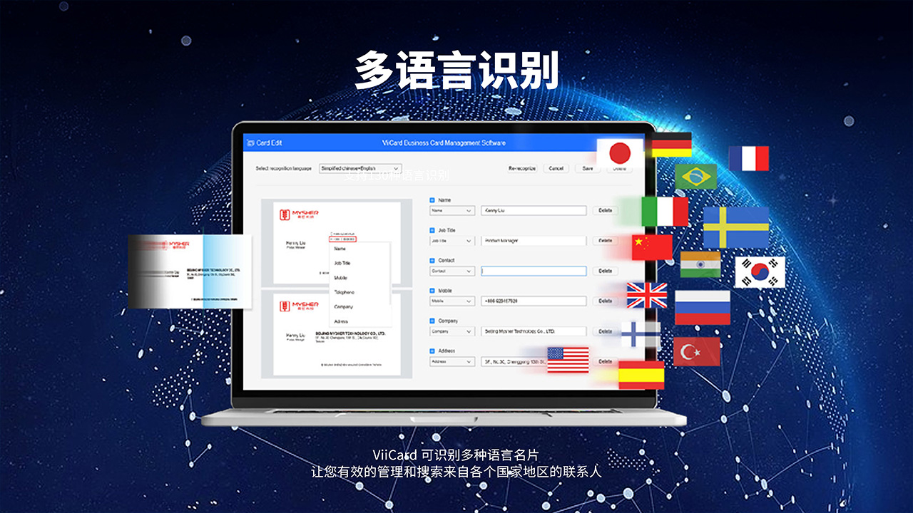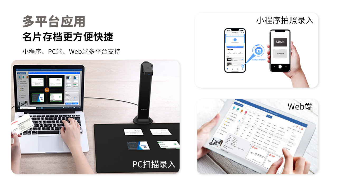 维山名片扫描仪搭配ViiCard安全名片扫描管理软件,可精准辨识中、英、日、韩、法、德、义…等130种语系。让团队成员轻松将名片数字化建档,快速扫描及储存名片资讯至云端,可兼容USB拍摄仪、TWAIN驱动平台扫描仪、微信小程序等等,并同步到伺服器集中管理与应用,随时随地共享联络人资讯。