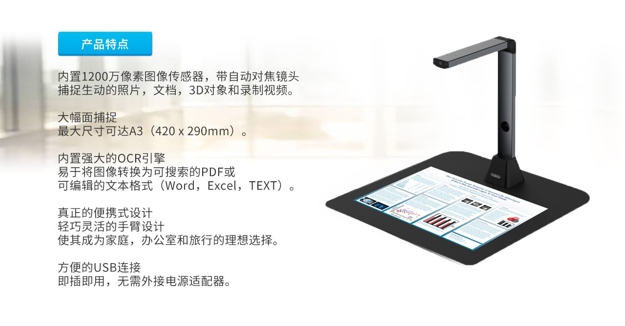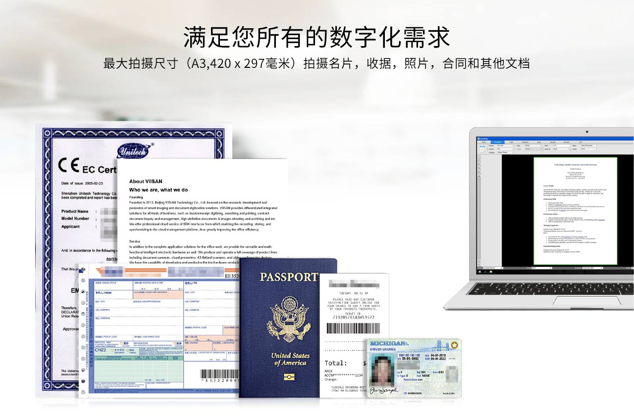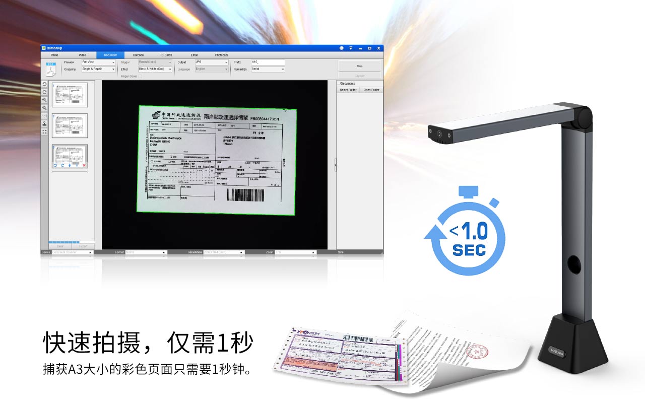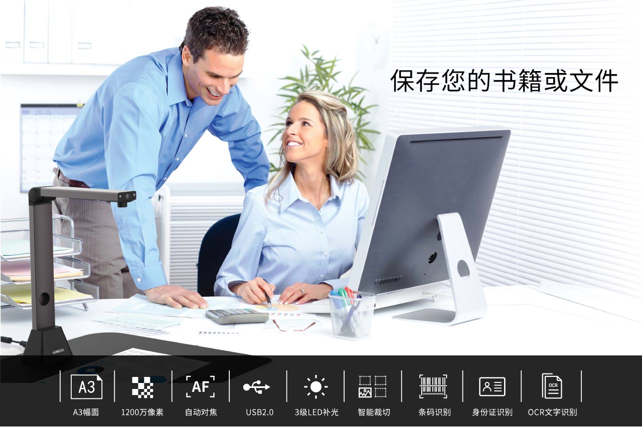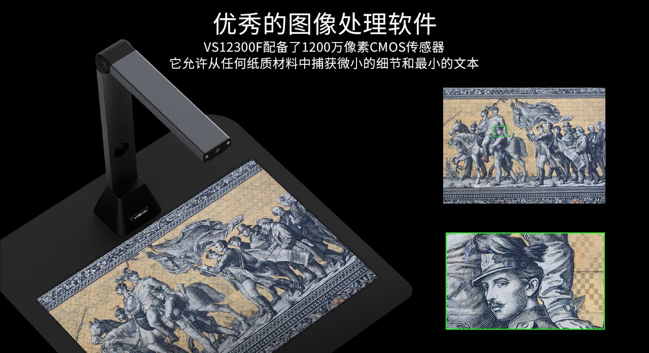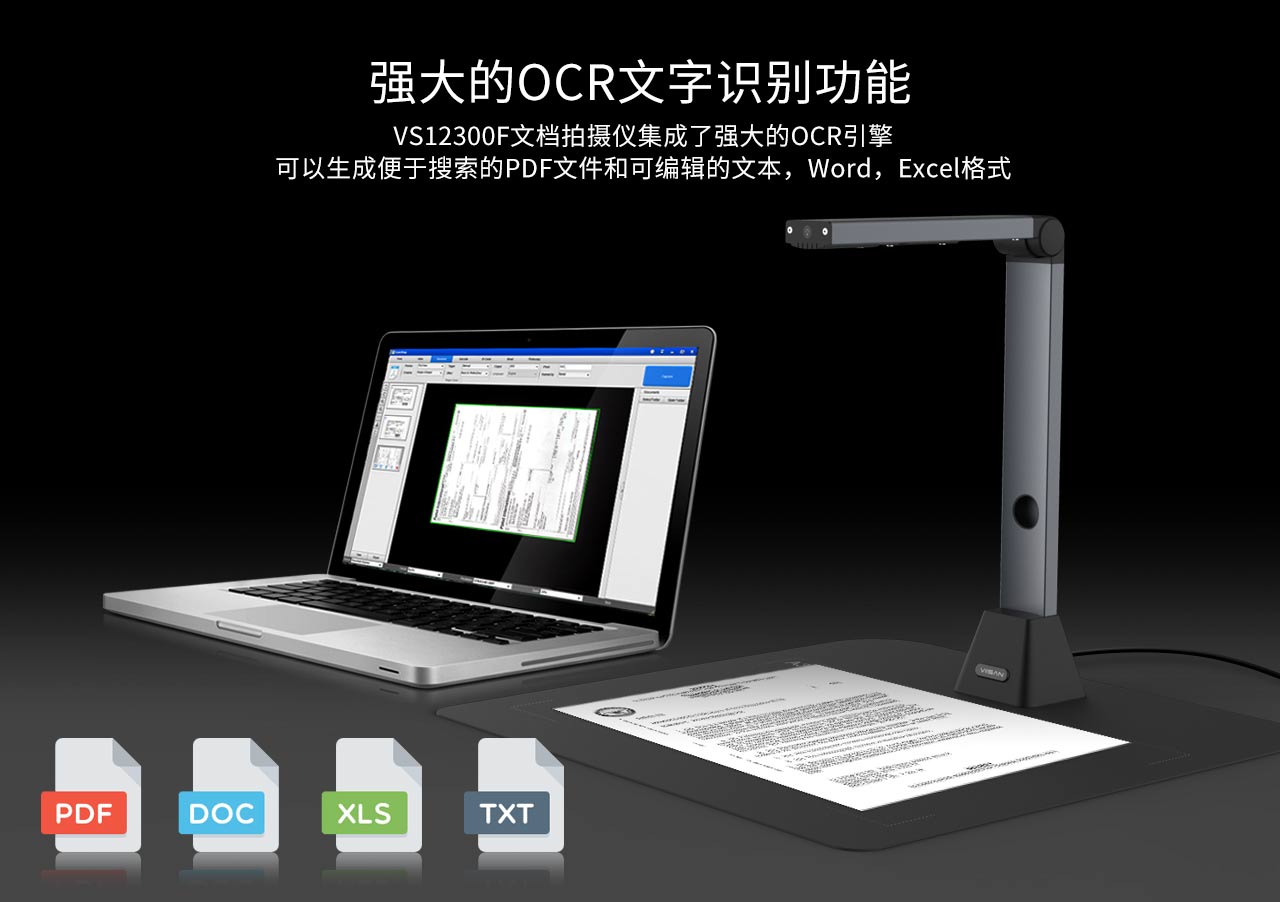 VS12300F文档拍摄仪采用灵活的设计,内置1200万像素图像传感器,支持最大A3尺寸的拍摄幅面。 此外,VS12300F捆绑了强大的文档拍摄软件,可以拍摄照片和文档,录制视频,制作副本,发送电子邮件,条形码识别和ID,执行OCR并将图像转换为可编辑的Word和Excel文件格式。它可以帮助员工快速处理大量文档并提高工作效率。