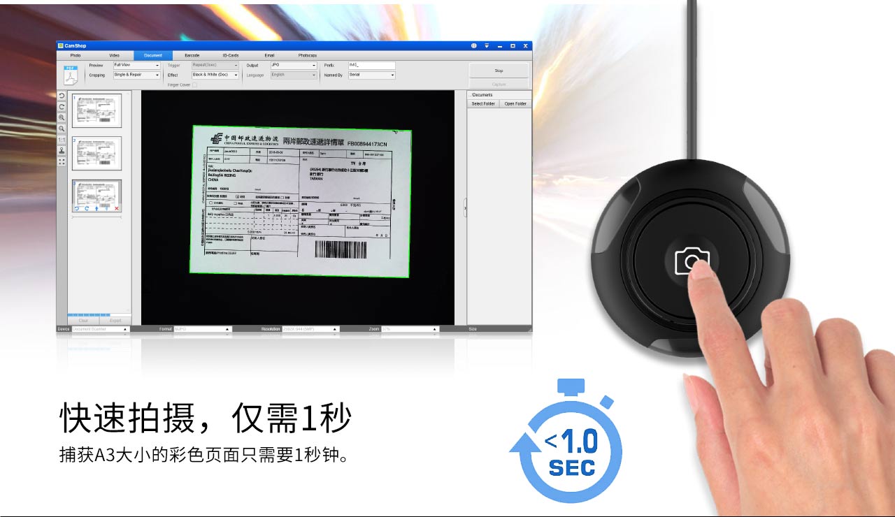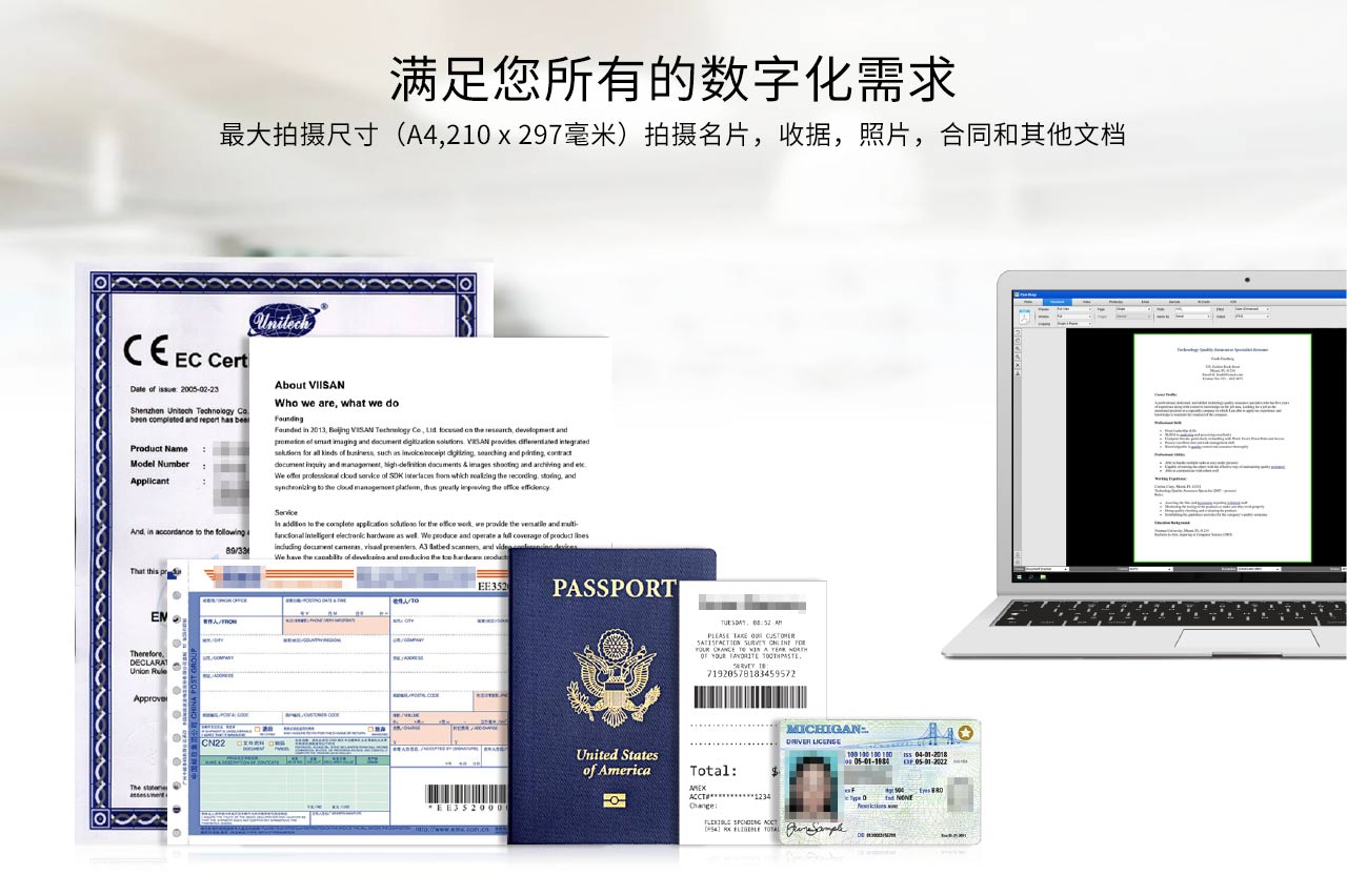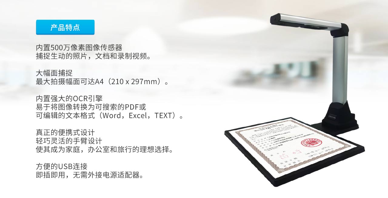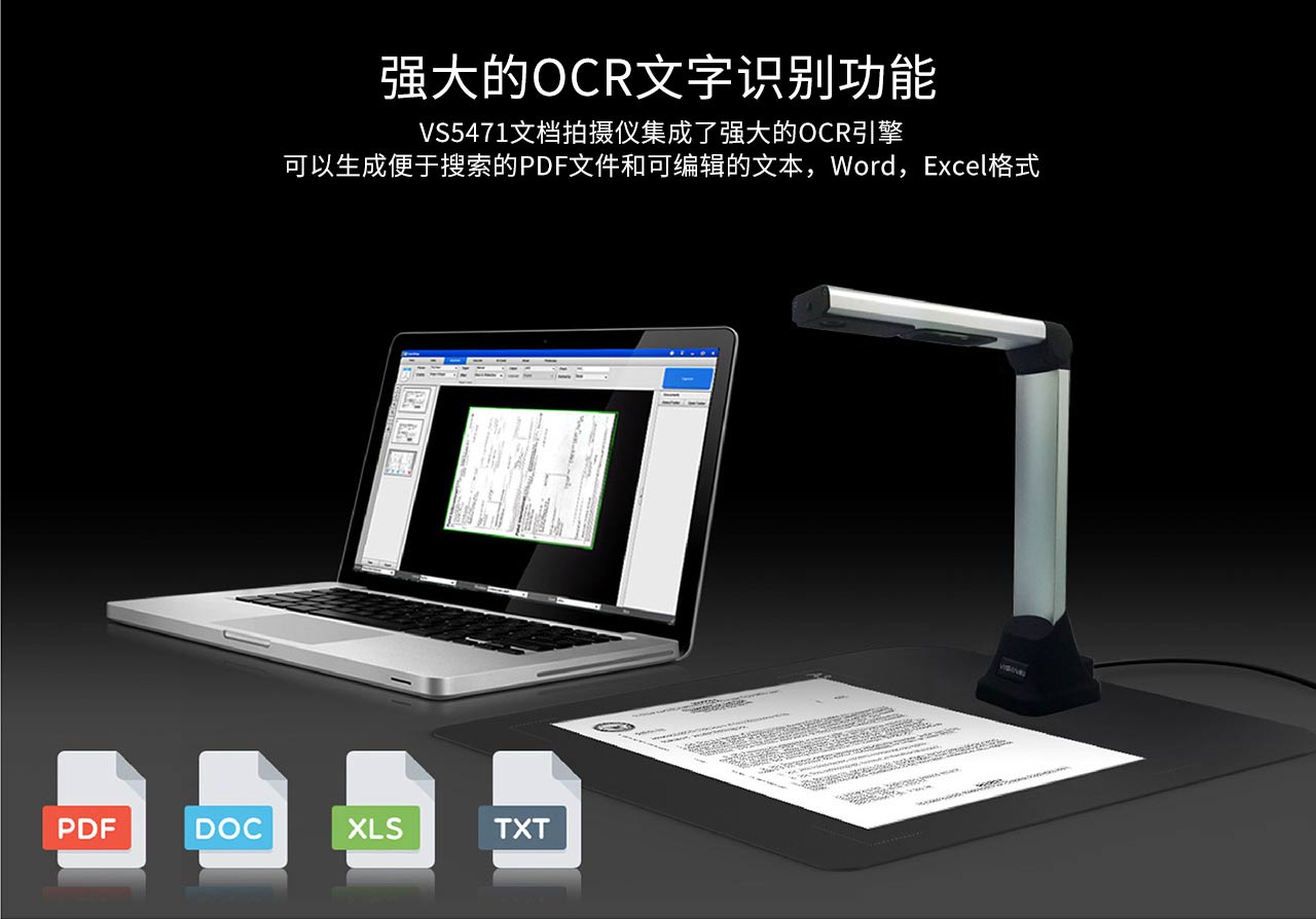 VS5471文档拍摄仪采用灵活的设计,内置500万像素图像传感器,支持最大A4尺寸的拍摄幅面。 此外,VS5471捆绑了强大的文档拍摄软件,可以拍摄照片和文档,录制视频,制作副本,发送电子邮件,条形码识别和ID,执行OCR并将图像转换为可编辑的Word和Excel文件格式。它可以帮助员工快速处理大量文档并提高工作效率。