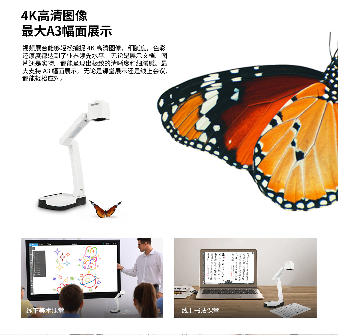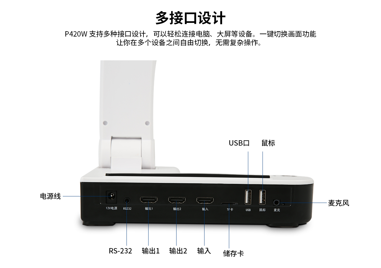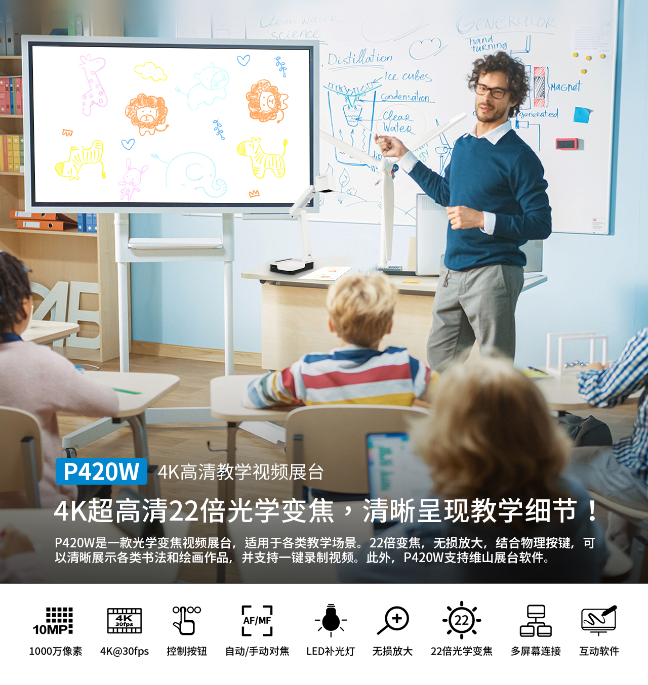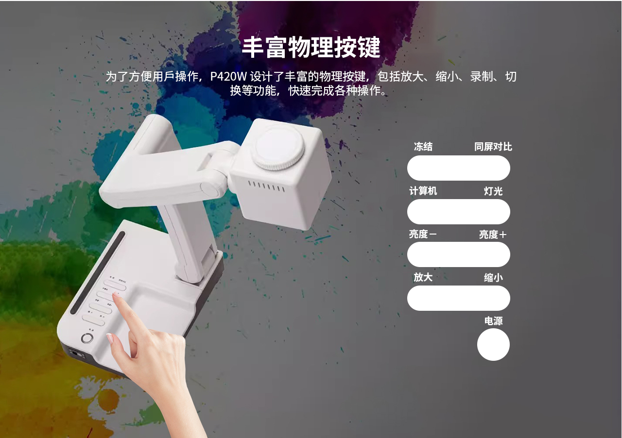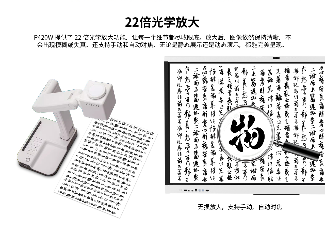 配备10 MP传感器和4K@30FPS视频功能,P420W可以通过清晰的图像捕捉每一个细节,无论您是展示课本、美术教学、还是进行现场演示都可以看到高清画面,展示每一个细节。