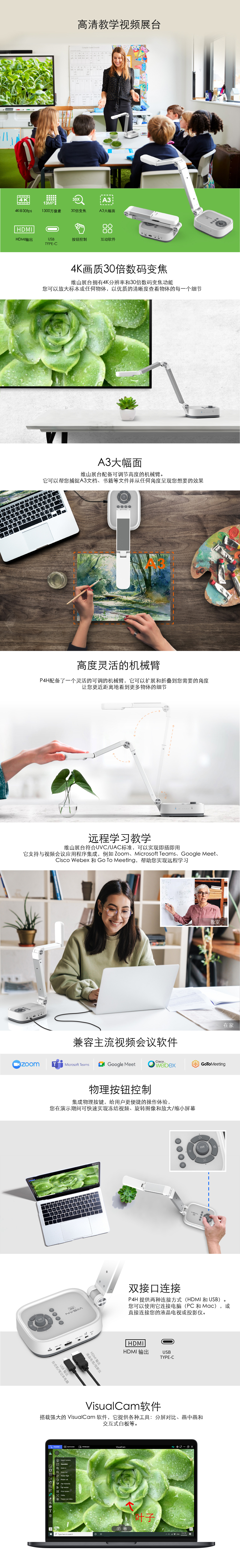 P4H 是一款4K高清教学视频展台,配备1300万像素摄像头可以实现4K、30fps以及 30X数码变焦功能,它可以帮助教师展示每一个细节,无论是演示页面、一本书,或显示一个标本的模型。 您的学生无论在课堂上还是远程都能看到清晰的图像。可折叠机械臂可以轻松折叠产品并存放在您携带的包里,非常方便老师随身携带设备,随时随地进行教学、录音、 直播或课程规划。