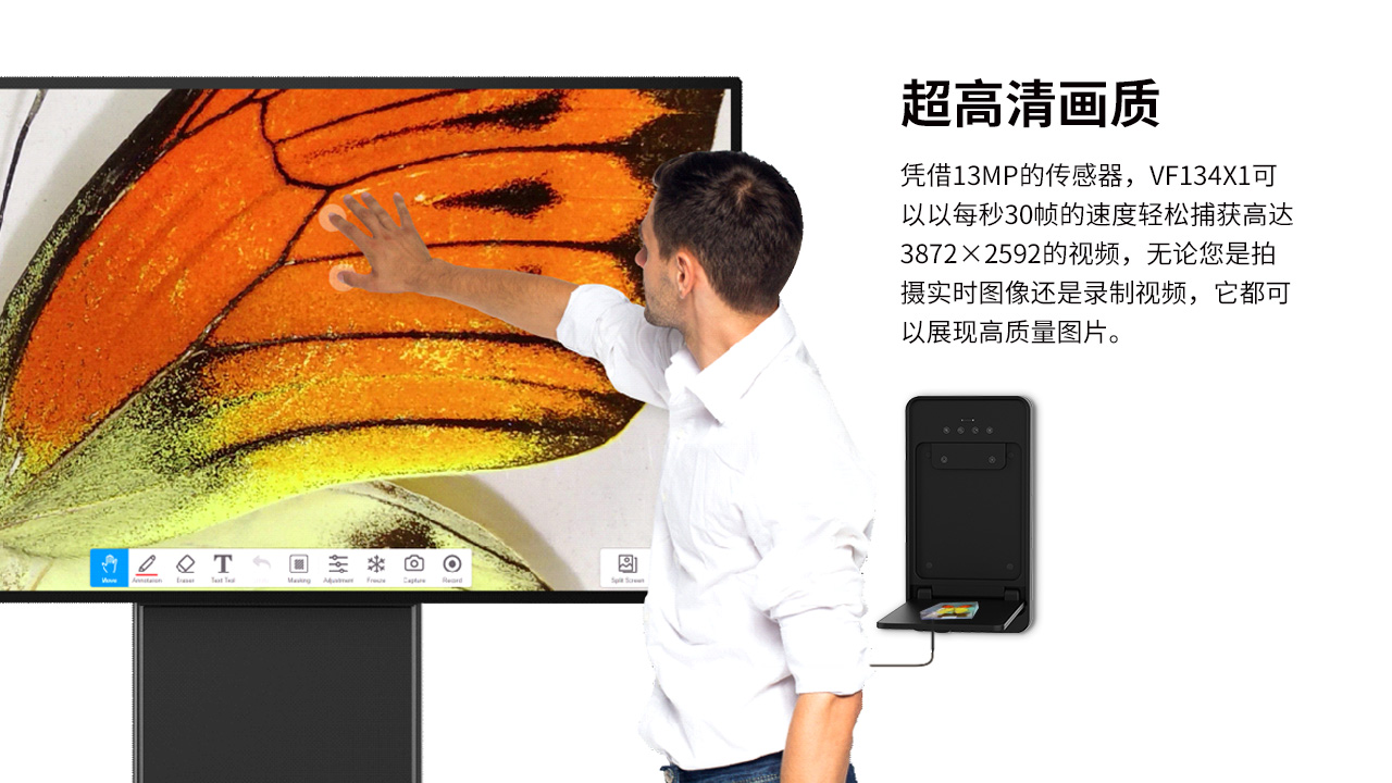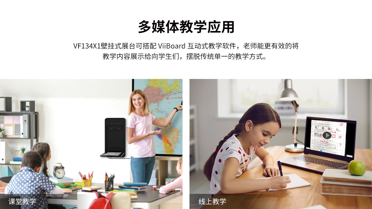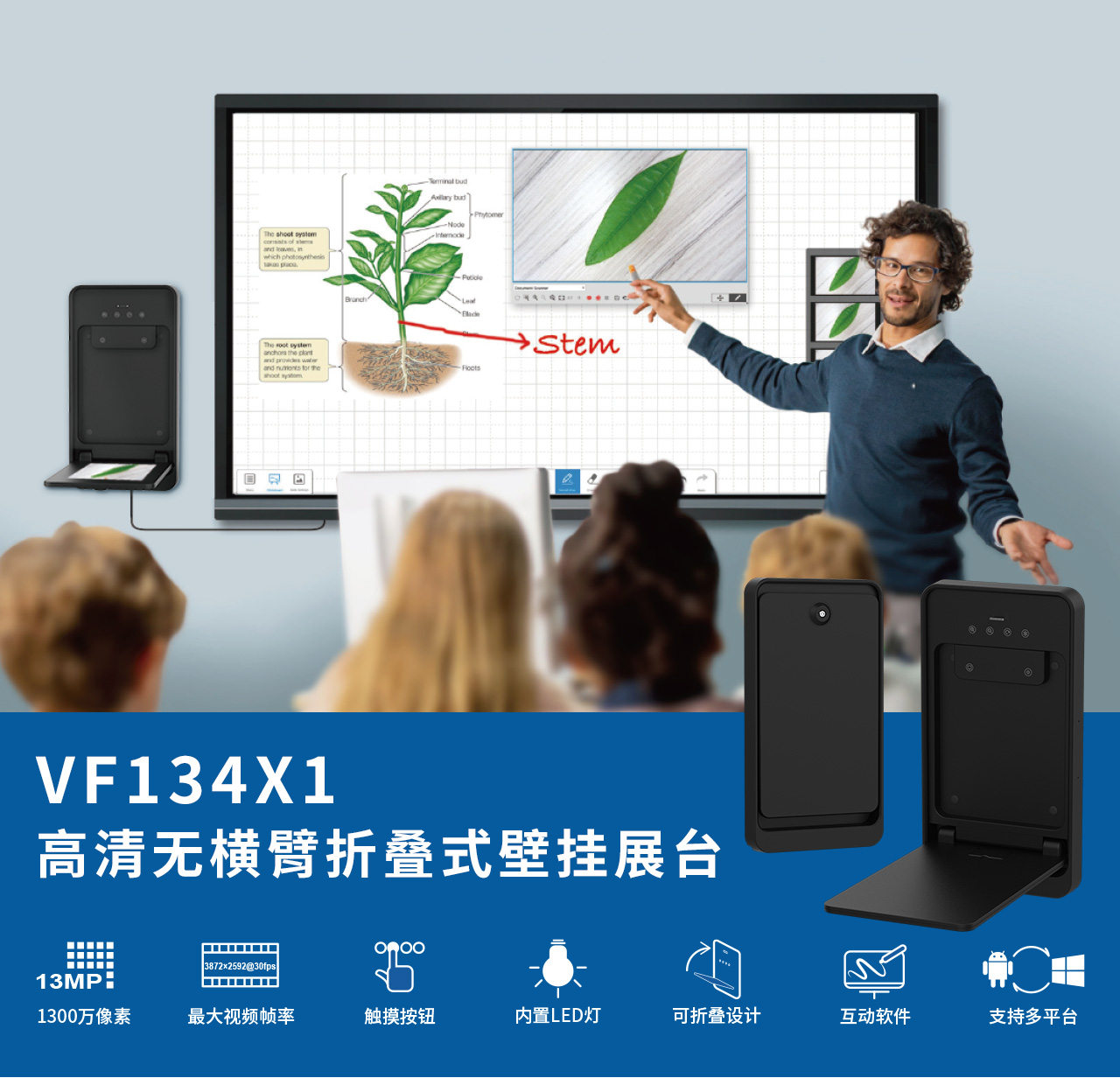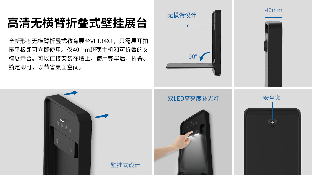 VF134X1是一款无横臂折叠式壁挂教育展台,专门为课堂使用而设计。该视频展台可以固定在墙上,以节省桌面空间,并具有可折叠的文稿展示台,用于显示书籍、文档和3D对象。使用完毕后,只需折叠并锁定即可增加安全性。
