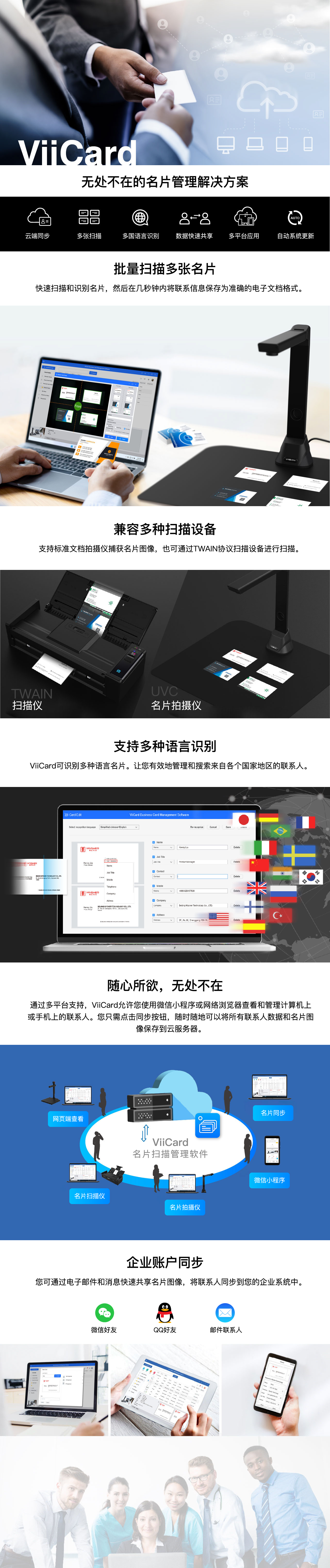 ViiCard是一款为中小企业提供的安全名片管理软件,可精准辨识中、英、日、韩、法、德、义…等130种语系。让团队成员轻松将名片数字化建档,快速扫描及储存名片资讯至云端,可兼容USB拍摄仪、TWAIN驱动平台扫描仪、微信小程序等等,并同步到伺服器集中管理与应用,随时随地共享联络人资讯。