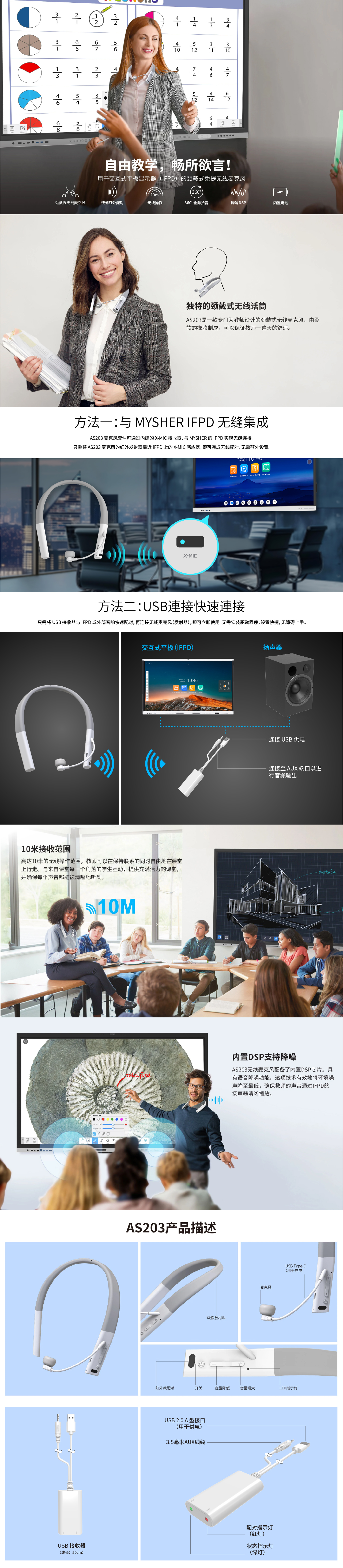 AS203麦克风套件是一款专为教育工作者设计的颈戴式无线 麦克风,可提升您的教学体验。它采用柔软的橡胶制成,佩戴 舒适,具有先进的红外配对技术,可在2米范围内无缝连接到 MYSHER IFPD。 为了与第三方交互式平板电脑或扬声器兼容,USB Dongle( 接收端)无需驱动程序即可快速与设备配对。AS203麦克风由 内置750mAh可充电电池供电,可提供长达6小时的连续运行 ,确保不间断的连续运行。 AS203配备内置DSP芯片,可最大限度地减少环境噪音,通过 IFPD的扬声器或外部扬声器提供清晰的教师交流。无线范围 可达10米。