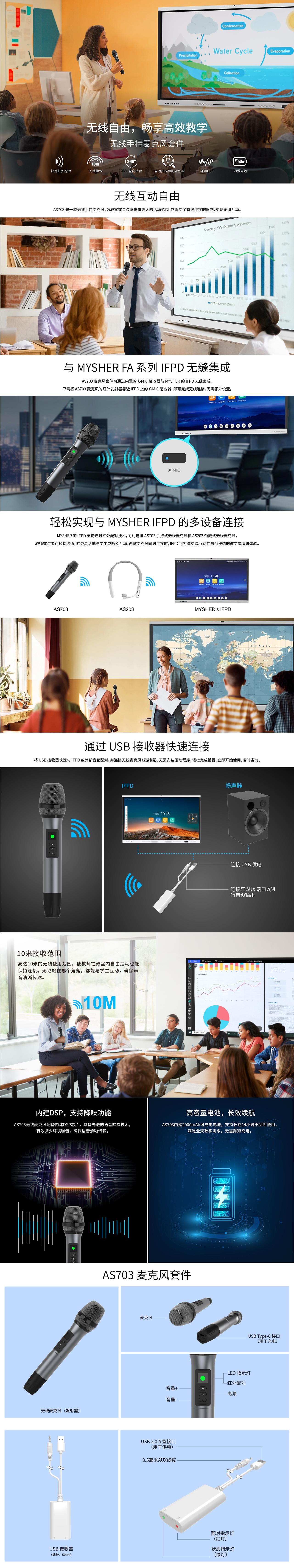 AS703 是一款专为教育工作者设计的手持式无线麦克风,可提供无缝可靠的课堂通信。它采用先进的红外配对技术,可在 2 米范围内轻松连接到 MYSHER IFPD。为了兼容第三方交互式平板显示器或扬声器,随附的 USB 接收器可快速配对,无需驱动程序,从而消除了有线连接的限制,并提高了教学灵活性。AS703 内置 2000mAh 可充电电池,可确保长达 14 小时的连续运行,支持不间断的课程。其集成的 DSP 芯片有效降低环境噪音,通过 IFPD 扬声器或外部扬声器提供清晰专业的音质。凭借高达 10 米的无线范围,教师可以在教室内自由走动而不会断开连接,这使得 AS703 成为营造引人入胜、充满活力的学习环境的重要工具。