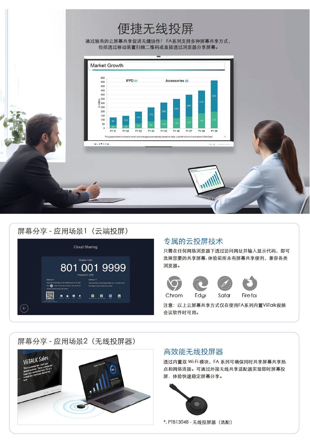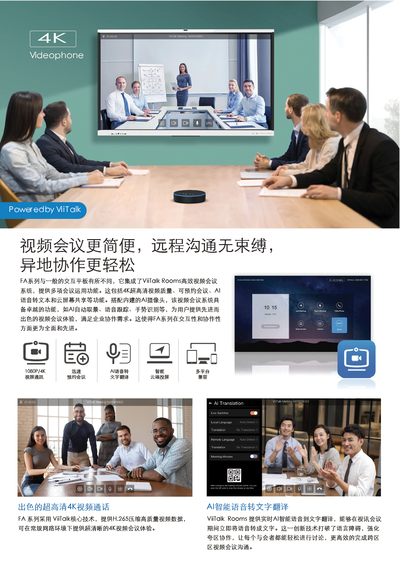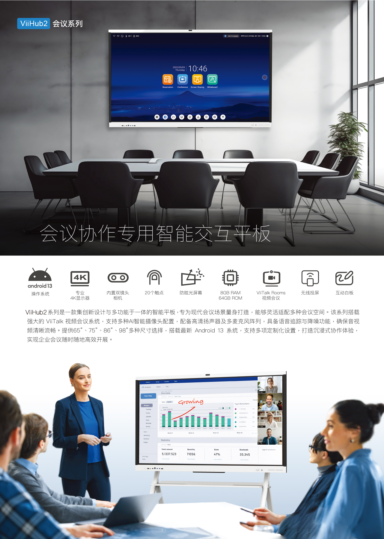 ViiHub2系列是一款全新的智能交互式平板,适用于各种会议空间。该智能交互会议平板集成了专属的 ViiTalk Rooms专业视频会议系统, 双目AI摄像头、双20瓦扬声器以及语音跟踪和降噪技术的多麦克风阵列,可实现 1080P或4K超高清视频会议体验。此外该互动平板 搭载最新的Android 13 系统,提供多种尺寸选择(65、75、86寸),同时支持定制化规格选项,为企业提供最佳的视讯会议体验, 促进企业随时随地的协作。
