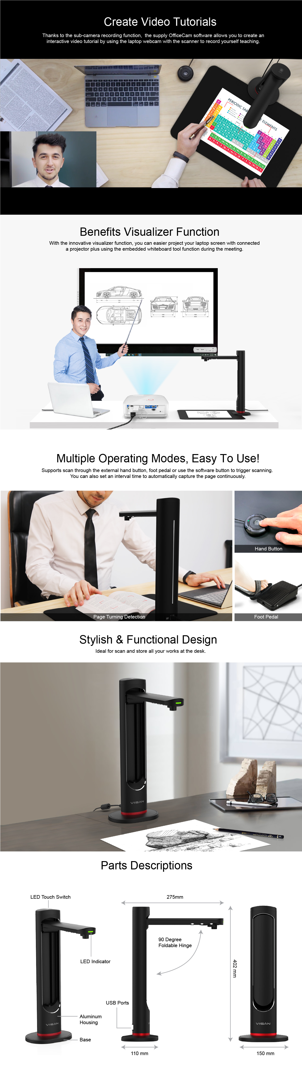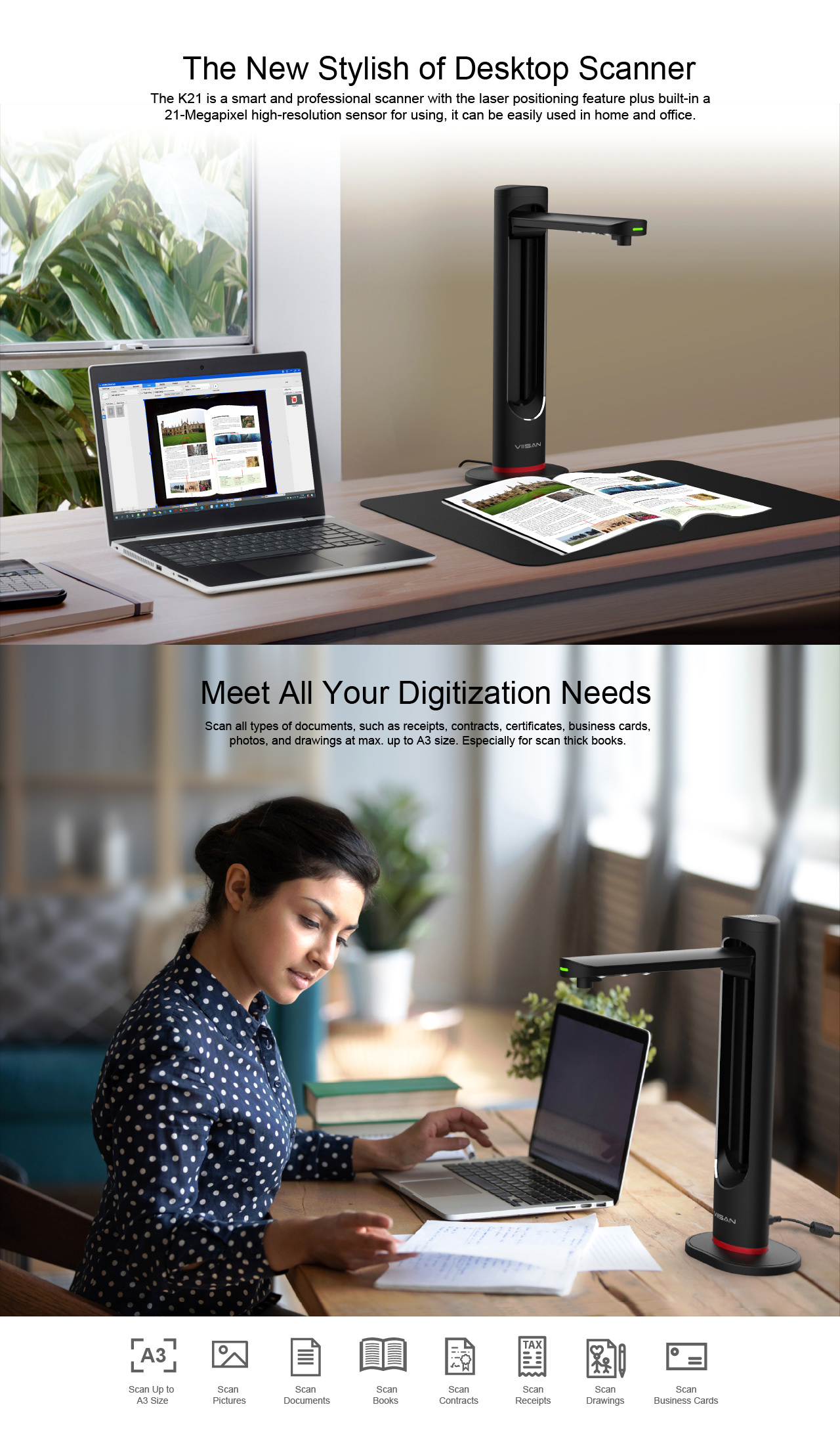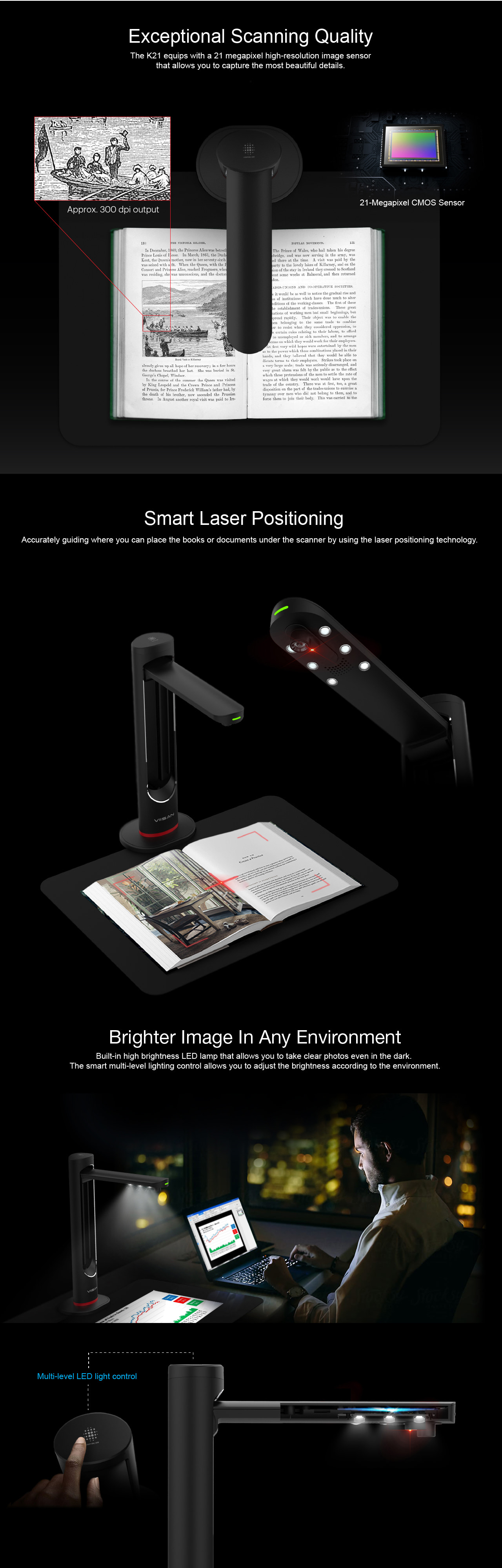 The K21 is a smart and professional camera scanner with the laser positioning guide feature for desktop and laptop using the USB connection. with its built-in 20.1-megapixel CMOS camera sensor it can capture and output exceptional quality images. Along with these great features, you can use the bundled OfficeCam scanning software with this scanner to get great results while scanning books. For example, it can automatically digitally flatten curved pages, erases fingers from the scanned photos, repairs the damaged edges of documents, purifies background, rotates pages based on text orientation, and automatically splits the both-side page into the separate image file. besides, you can use the embedded OCR feature to convert a batch scanned images into a searchable PDF or editable Word, Excel, Text-to-speech file formats.