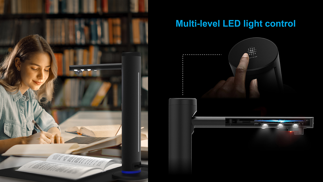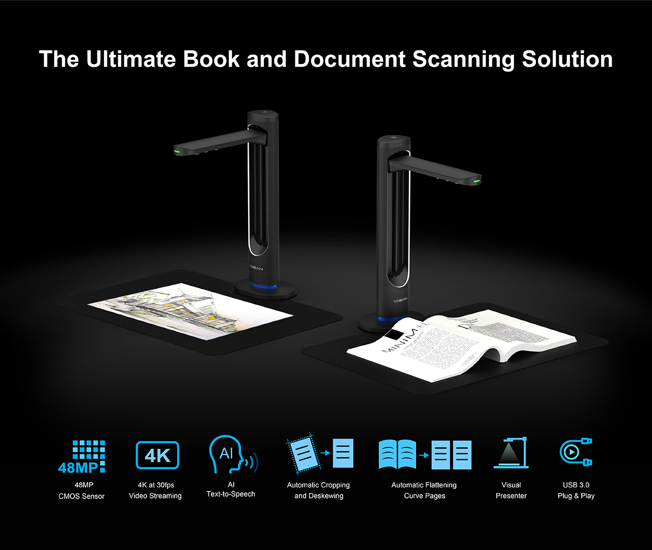 The K48 is an ultra-high-resolution camera scanner equipped with a laser positioning guide and a USB 3.0 connection for use with desktops and laptops. Featuring a 48MP CMOS sensor, it enables detailed scanning of A3 documents and recording of 4K videos at 30fps. With the bundled OfficeCam scanning software, the K48 delivers exceptional results and enhances efficiency when scanning books. Its advanced features include automatically flattening curved pages, erasing fingers from scanned images, repairing damaged document edges, purifying backgrounds, rotating pages based on text orientation, and splitting dual-page spreads into separate image files. Additionally, the embedded OCR feature allows you to convert a batch of scanned images into searchable PDFs or editable Word, Excel, and Text files. It also supports text-to-speech functionality, enabling conversion into MP3 or WAV audio files. The AI reading feature further makes it ideal for language learning and assisting individuals with dyslexia.