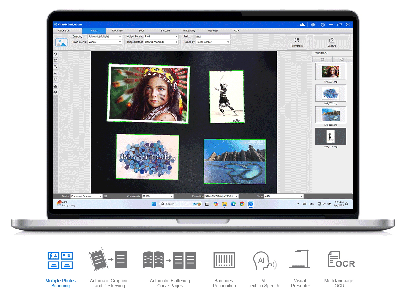 The VIISAN OfficeCam scanning software offers an intuitive user interface and a comprehensive suite of image processing features. It allows users to capture snapshots, scan documents or books into image files, and convert them into searchable PDFs or editable formats such as Word, Excel, or Text using its built-in OCR engine. Additionally, the software supports barcode recognition and includes a Text-to-Speech feature for generating MP3 audio files from text.