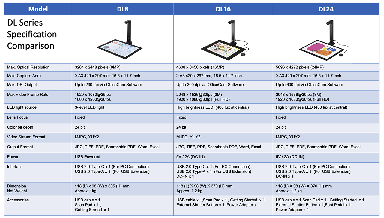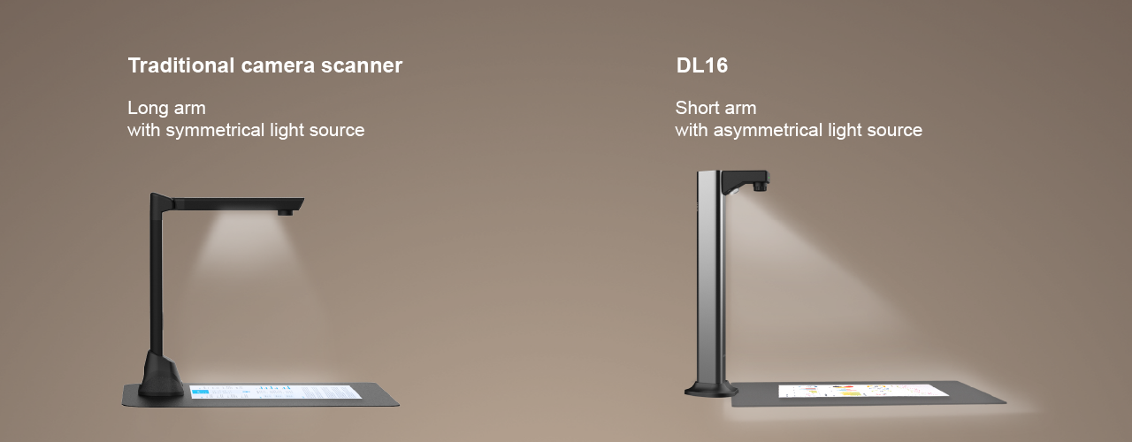 The DL16 features a short-arm camera that reduces the space which a device on a desk needs to use.