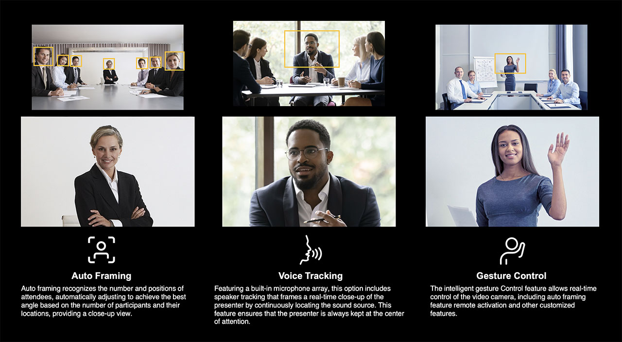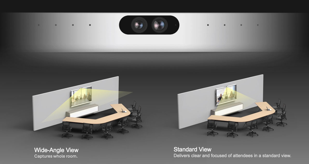 The wide-angle lens ensures a clear view of all participants, while the standard lens automatically frames the active speaker for a focused close-up.
