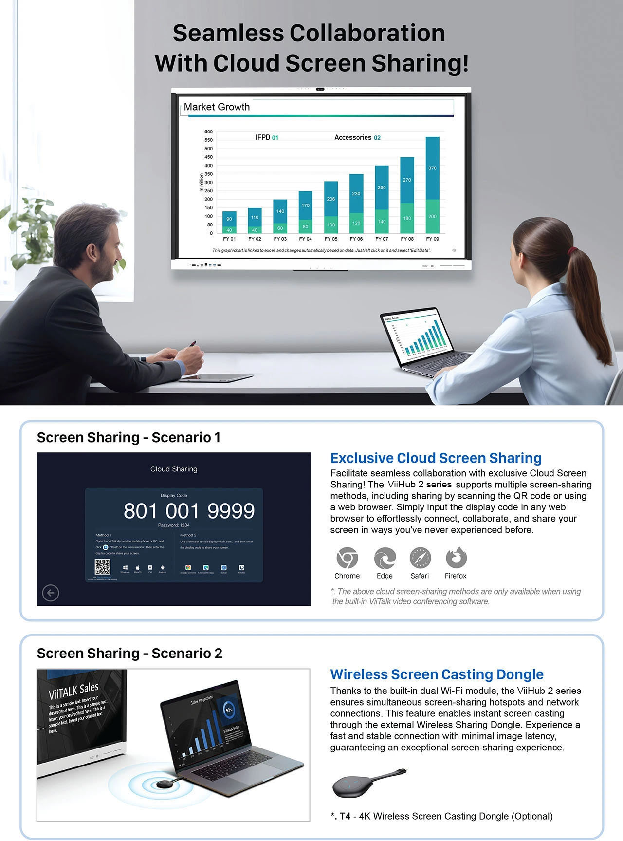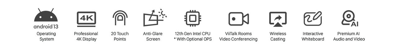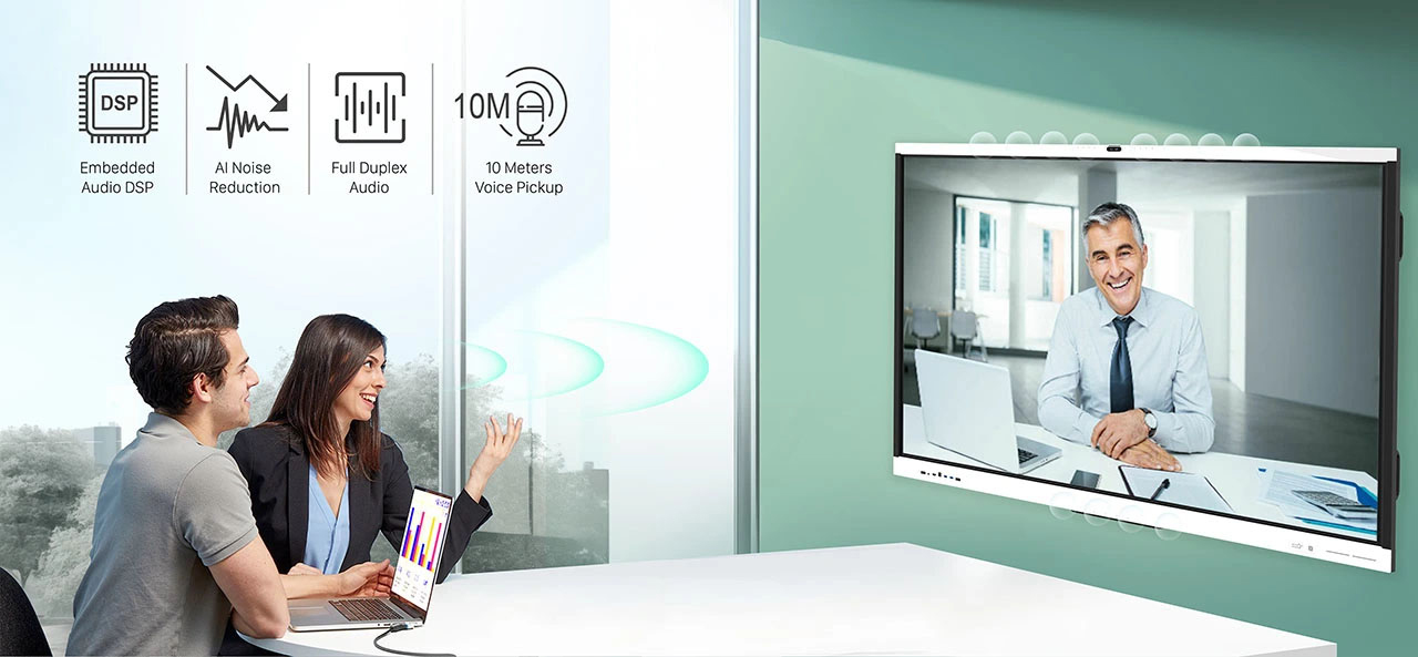 The ViiHub 2 is a smart Interactive Flat Panel built for modern meetings, featuring the ViiTalk Rooms 4K system with AI-powered Auto Framing, Speaker Tracking, Whiteboard Tracking, and Gesture Recognition. Equipped with dual 50MP cameras and an 8-microphone array, it delivers stunning video clarity and crystal-clear voice pickup for an exceptional conferencing experience.