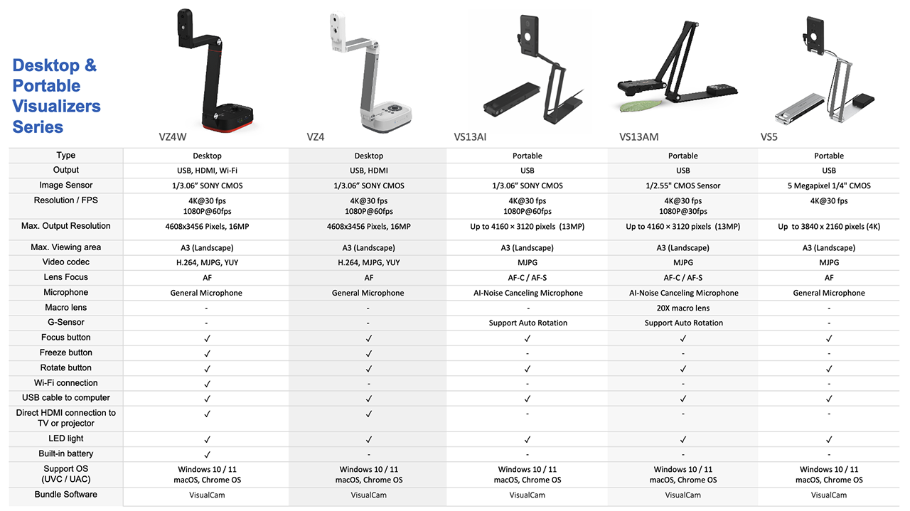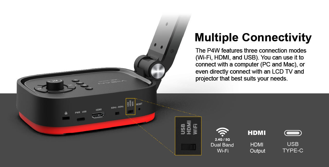 The P4W is a wireless portable visualizer (Document Camera) with a 13-megapixel camera, 4K at 30fps streaming, and 30X digital zoom capability, it allows the teacher to show every detail without any missing, no matter for demonstrating books, or to show any materials. your students can see clear image whether they are in-class or remote, the foldable mechanical arm can be firmly folded into a neat body and stored in the bag, it is very convenient for the teacher to carry the device anywhere for teaching, recording, live streaming or planning of the course. Besides, the P4W has an easily operable control panel and build-in a high capacity 9-hours battery to improve the teaching efficiency.