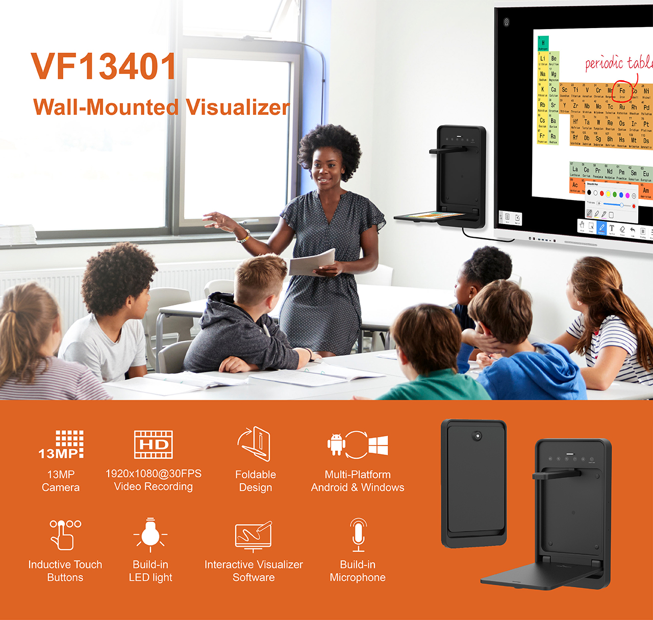 The VF13401 is an affordable and robust wall-mounted visualizer designed for classroom use. Integrated with a high quality lens, it ensures sharp and clear images, capturing even the finest details with precision. Easily fixed to the wall, it saves desk space and promotes a clutter-free learning environment. The VF13401 features a convenient fold-out stage for displaying books, documents, and 3D objects, making it perfect for educational presentations. With a 13MP camera, it guarantees high-resolution imagery, delivering crisp and vivid visuals to enrich the learning experience. After use, the visualizer can be effortlessly folded away and securely locked for added protection, ensuring its longevity and reliability in the classroom.