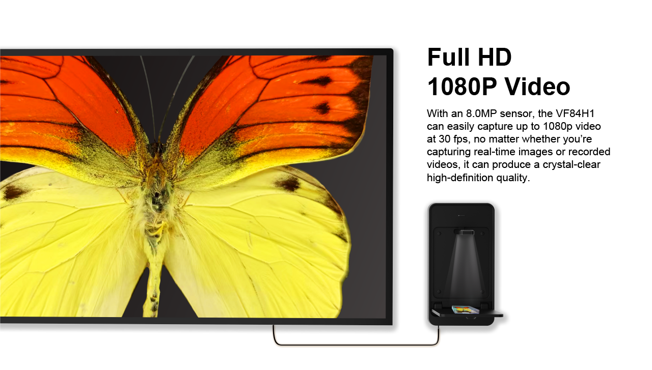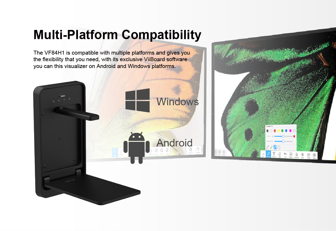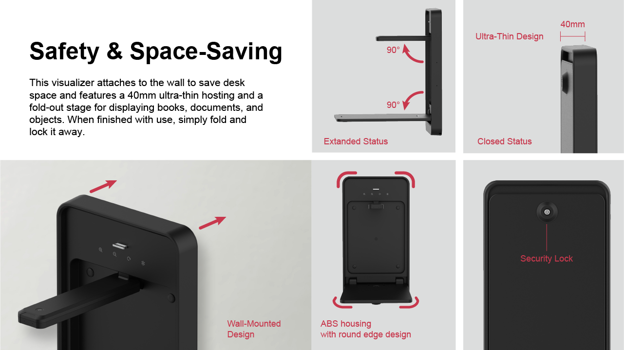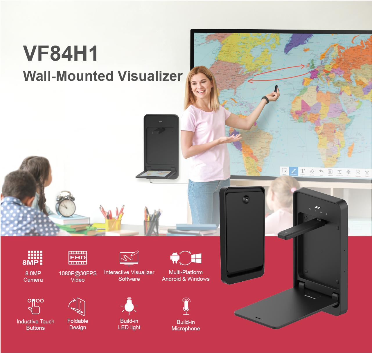 The VF84H1 is an affordable and robust wall-mounted visualizer specially designed for use in class, this visualizer can be fixed to the wall to save desk space and features a fold-out stage for displaying books, documents, and 3D objects. When you are finished with use, simply fold away and lock for added security.