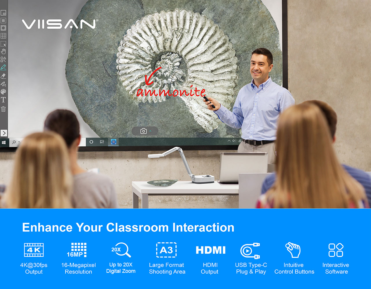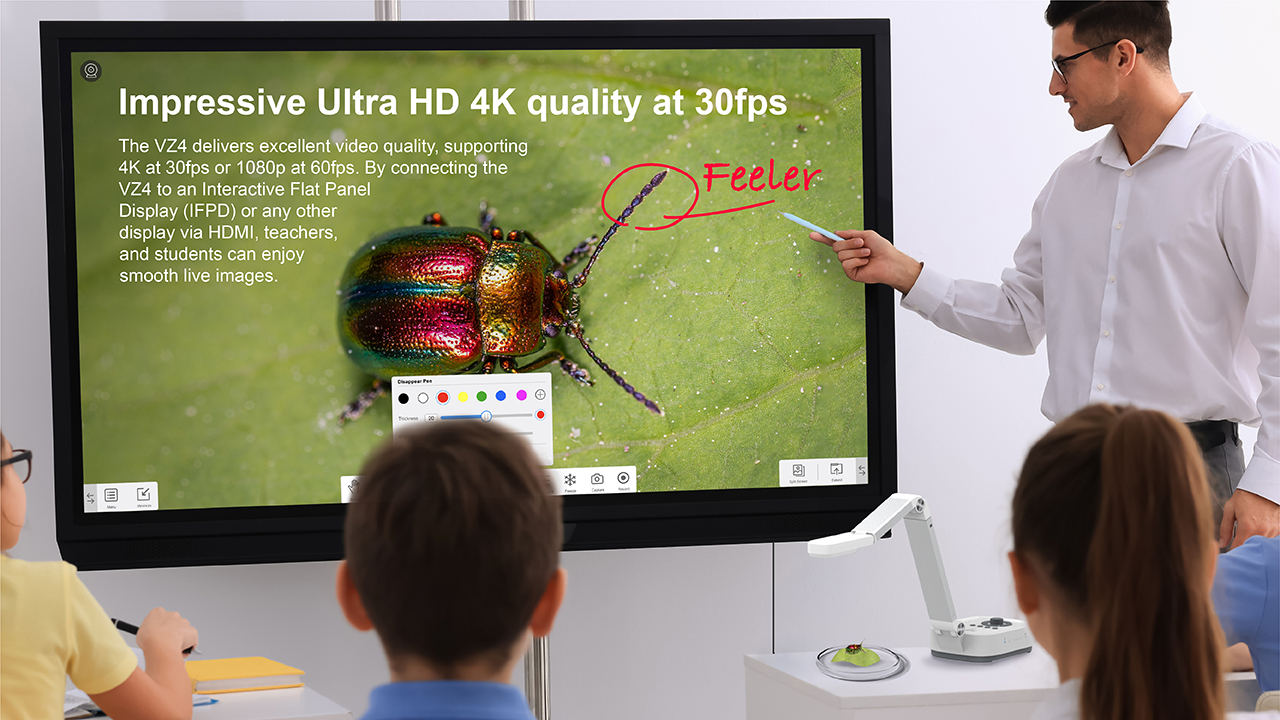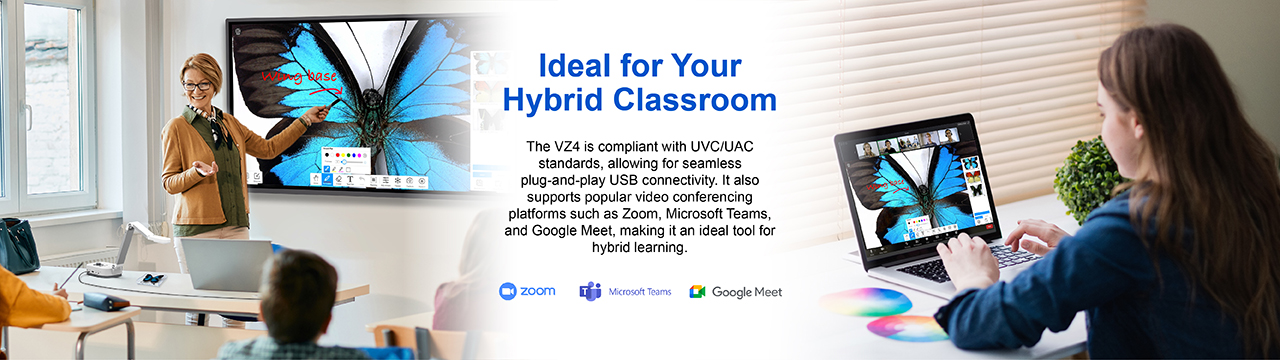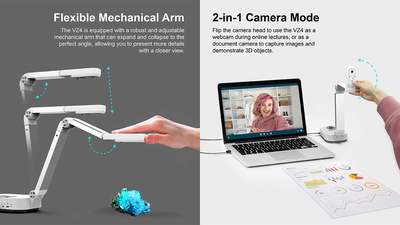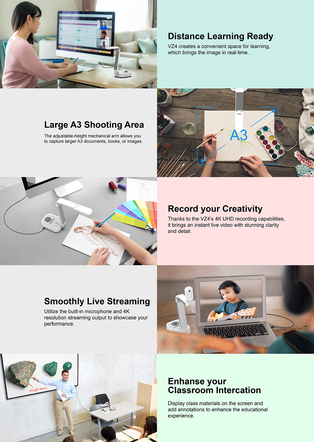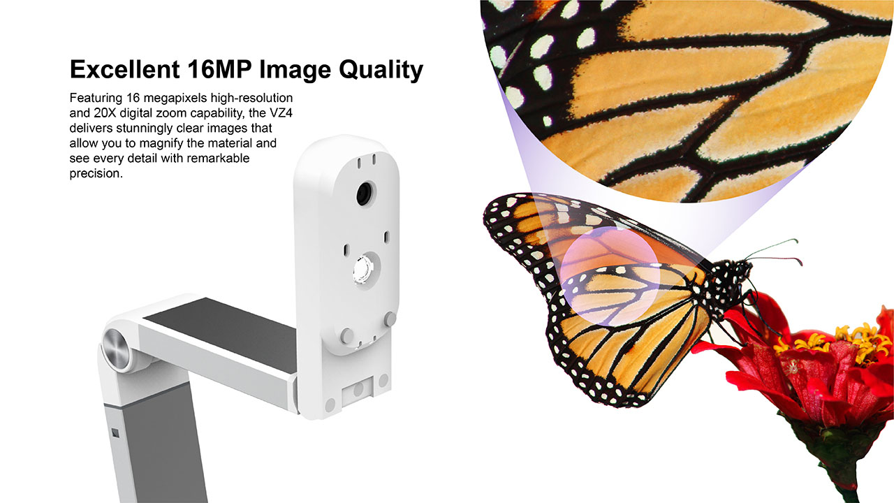 The VZ4 is a versatile 2-in-1 visualizer (document camera) featuring a 16-megapixel resolution and 4K streaming at 30fps. With its 20x digital zoom (achieved through software), this powerful tool captures every detail during presentations, whether you’re demonstrating books or other materials. Students can enjoy crystal-clear images, whether they are in class or learning remotely.