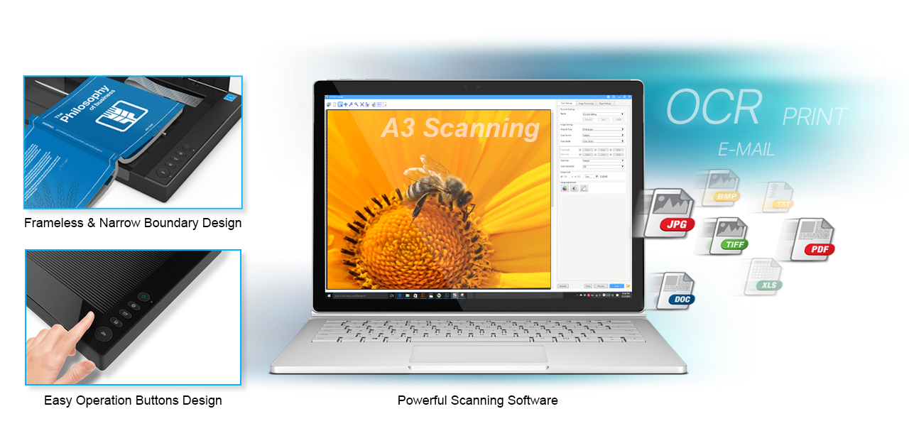 VIISAN VF series is the best A3 large-format scanners for professional quality imaging, the VF series features in frameless and narrow boundary with detachable lid design, which can meet all your diverse scanning needs. Besides, those scanners comes bundled with a powerful software, which includes advanced features such as scanning to Folder/PDF/Email/Print, creating text OCR or opening scans with a specified application. It can easily customize your scan tasks based on your requirements for different types of documents.